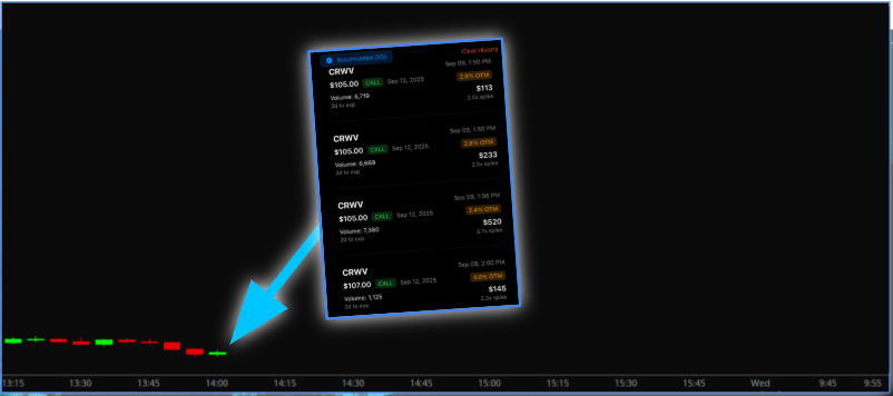 Here’s CRWV… a massive volume spike on the $105 calls before the trade moved.